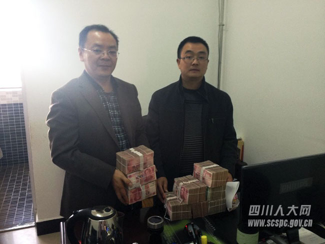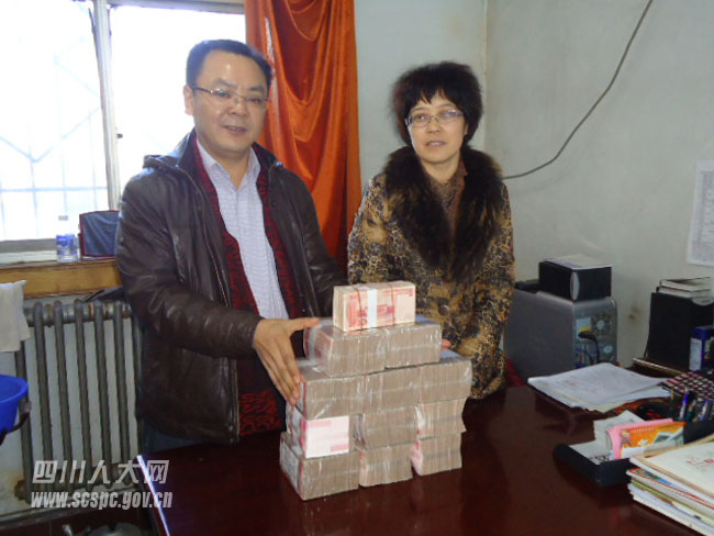 图为2014年11月17日,陕西澄城县住建局纪检专员将被拖欠的115万元交由王晓荣手中