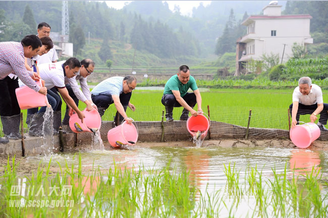 2018年6月,刘淼与古蔺县、龙山镇领导一起在向田村的高山水稻田投放鱼苗