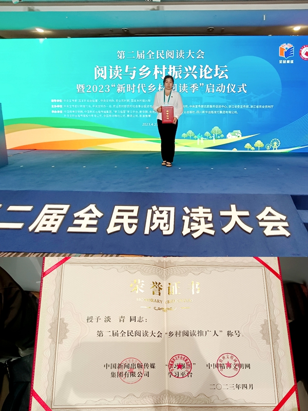 4月23日,第二届全民阅读大会·阅读与乡村振兴论坛暨2023“新时代乡村阅读季”启动仪式在浙江省杭州市举办。启动仪式现场宣布了第二届全民阅读大会“乡村阅读推广人”评选结果。四川省雅安市天全县新华乡永安村农家书屋管理员淡青获得第二届全民阅读大会“乡村阅读推广人”荣誉称号,成为全国50名、四川省2名获此殊荣的“乡村阅读推广人”之一。