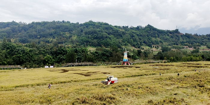 近日,天气放晴,思延镇铜头村人大代表小组组长、村支部书记高志强正组织队伍收割芦山县万亩粮经复合园思延片区最后130亩水稻。