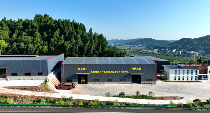 (图为船形村党群服务中心和以集体经济模式建立的仓储冷链物流中心、建筑用品加工厂)