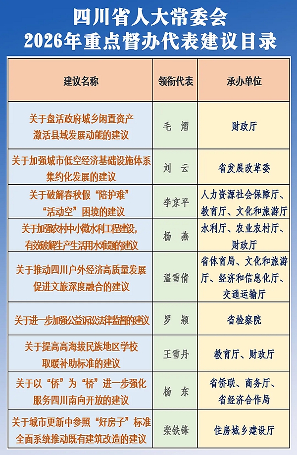 今年2月上旬召开的省十四届人大五次会议收到代表建议1328件。根据代表法的相关规定,按照省人大常委会“一要点三计划”工作部署,主任会议从1328件代表建议中选取9件作为2026年常委会重点督办建议,旨在充分发挥重点督办建议的示范引领作用,切实提高代表建议办理工作质效。这9件代表建议的内容涉及破解春秋假“陪护难”“活动空”困境、盘活政府城乡闲置资产激活县域发展动能、加强城市低空经济基础设施体系集约化发展、城市更新中参照“好房子”标准全面系统推动既有建筑改造、提高高海拔民族地区学校取暖补助标准、加强农村中小微水利工程建设破解生产生活用水难题、加强城市低空经济基础设施体系集约化发展、推动四川户外经济高质量发展促进文旅深度融合、加强公益诉讼法律监督等方面。