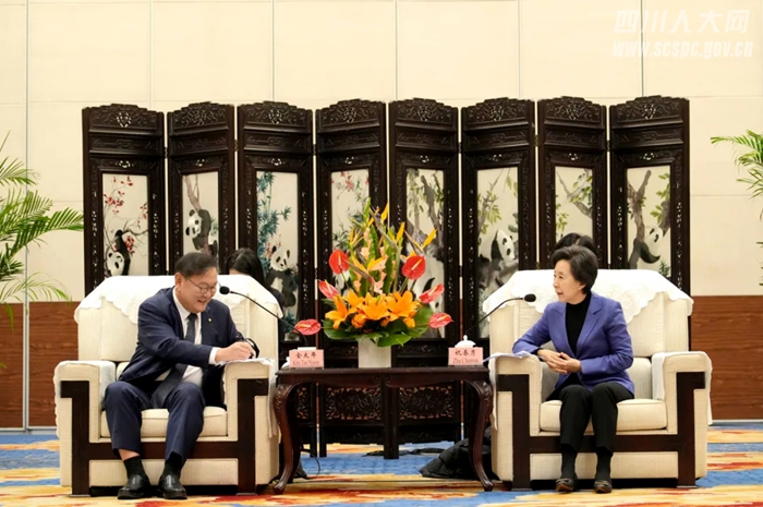 祝春秀对金太年一行的到来表示热烈欢迎,并介绍了四川经济社会发展情况及川韩交流合作成果。她指出,中韩是搬不走的重要近邻,也是分不开的合作伙伴。四川作为中国西部的经济、人口、资源和科教大省,近年来经济持续健康发展,产业体系渐趋完备,开放态势显著。四川与韩国交往密切,高层互访频繁,经贸合作持续深化,人文交流活跃,大熊猫合作成为两国友好象征,多对友城关系扎实推进。她表示,希望以此次访问为契机,进一步推动两地立法机构交往,深化产业互补合作,拓展友城务实交流,为两国关系发展注入新动力。