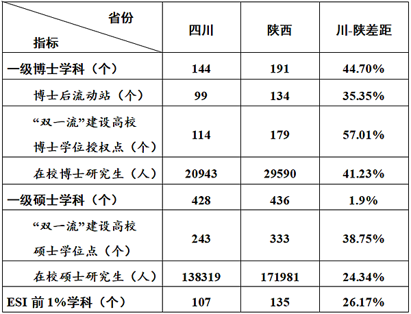 3.高层次人才供给能力不够有力。与陕西省相比,在“双一流”建设高校的学科数量、学科等级、高层次人才培养规模等方面,我省还存在明显差距。四川、陕西“双一流”建设高校均为8所,四川省博士学位授权点161个、硕士学位授权点706个,分别较陕西少26.06%、38.75%;在校博士生人数、在校硕士生人数分别少36.14%、18.03%。四川高校ESI前1%学科107个,陕西135个,少17.81%。相关数据见表2。