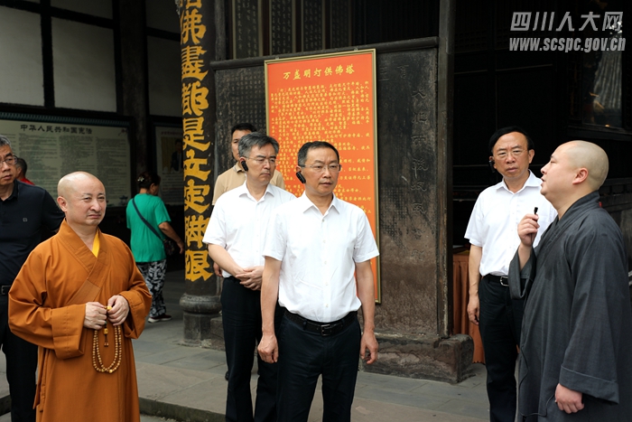 上午,调研组一行来到新都区宝光寺,实地查看宝光寺文物保护、文化平台建设等情况,认真听取了意寂法师的介绍,详细了解了近年来宝光寺在坚持佛教中国化方向、寺庙依法管理、重点文物保护、传统文化传承、佛教人才培养等方面的具体做法,并与区人大常委会、统战部相关负责人就推进宗教中国化方向、文化生态寺院建设等进行了座谈交流。调研中,何延政对宝光寺进一步加强和创新寺庙管理工作取得的成效表示肯定。他强调,要提高政治站位,坚持宗教中国化方向,积极与社会主义社会相适应,继承弘扬爱国爱教优良传统,教育引导僧侣感党恩、听党话、跟党走,坚定不移维护祖国统一和民族团结;要依法管理宗教事务,不断提升宗教工作规范化法治化水平;要高度重视寺庙消防和文物安全,用好人防物防技防手段加强寺庙文物管理;要继续深入挖掘自身特有优势,进一步做好文化传承和推广,为建设美丽宜居城市和世界文化名城贡献力量。