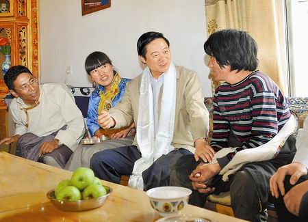 天蓝蓝,草青青,平坦如砥的草原上鲜花盛开,美丽的大草原敞开热情的胸怀迎接八方来宾。红原县安曲乡下哈拉玛村藏族村民仁真泽旺一家人沉浸在喜悦之中,省委书记来到他家刚刚建好的新房做客。在按照藏家风格装修的客厅里,刘奇葆详细询问主人家建房、装修用了多少钱,有没有贷款,喜不喜欢到这里定居。仁真泽旺讲,虽然贷了些款,但只要把牦牛养好,很快就可以还清。现在定居点上的房子一家挨一家地盖起来,大家都喜欢到这里定居,享受现代生活。看完客厅和卧室,刘奇葆还特地走进卫生间和厨房,仔细察看自来水引入和下水道排水情况。看到厕所修建在房屋旁边,他建议设计单位在细节上作些调整,使厕所与房屋在内部连通,让群众冬天、雨天上厕所时更方便。
