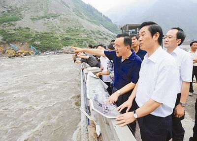 8月16日,省委书记、省人大常委会主任刘奇葆再次来到汶川县映秀镇,察看岷江河道壅塞体处理和都汶路修复抢通情况,指导抢险救灾工作。