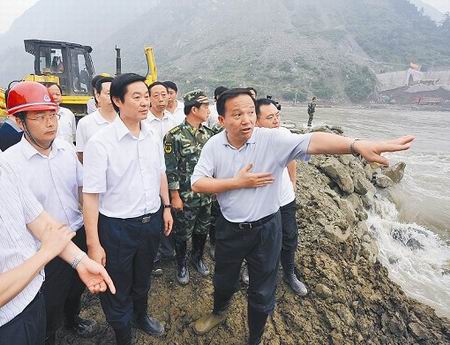 8月17日下午,刚刚在绵竹市清平乡指导抢险救灾工作后,省委书记、省人大常委会主任刘奇葆又赶赴汶川县映秀镇,指导抢险救灾工作。这是映秀镇暴发特大山洪泥石流灾害后几天来,刘奇葆第三次来到映秀镇。他强调,一定要按照既定的工作方案,继续拓宽、挖深壅塞体右岸泄洪道,筑牢防洪堤坝,让映秀镇进水的地方尽快退水,努力使映秀不再被水冲击,坚决打赢映秀镇保卫战。