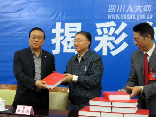 甘道明向出席揭彩仪式的来宾、成都市人大常委会主任王东洲赠送《大全》一书