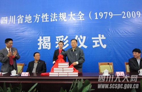 为纪念地方人大常委会设立30周年,进一步推动我省的地方立法实践,省人大常委会法制工作委员会在全面清理我省地方性法规的基础上,编辑了《四川省地方性法规大全(1979—2009)》(以下简称《大全》)一书。9月28日上午,该书揭彩仪式在省人大常委会新闻发布厅举行。省人大常委会党组书记、副主任甘道明亲自为该书揭彩,并向来宾赠送了《大全》。出席揭彩仪式的还有省人大各专门委员会、常委会各办事工作机构以及21个市州人大常委会的负责同志。部分新闻媒体记者参加了揭彩仪式。