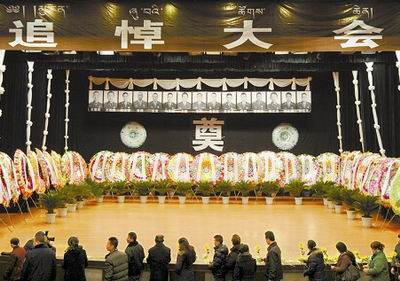 追悼大会现场,哀乐低回。主席台正中上方悬挂着鲜花翠柏簇拥的15名烈士遗像,下方摆放着各级领导以及各族群众送来的花圈和花篮,两侧悬挂着一副挽联:战火魔不畏艰险铸军魂,为人民甘洒热血写忠诚。四名礼兵分列主席台两侧,持枪肃立,护卫着战友的英灵。