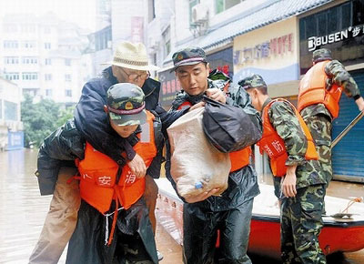 9月19日上午,广安市武警消防官兵在广安老城区紧急转移被洪水围困的群众。 邱海鹰 杨茂 摄