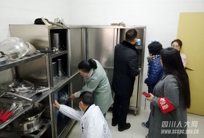 检查中,代表们和检查人员听取了镇政府管理部门关于食堂食品卫生安全监管汇报和学校负责人关于学校食堂食品卫生专项管理的情况汇报。检查人员观看了学校的食堂明厨亮灶工程监控视频,现场查看了学校食堂留样食品柜、炒菜间、食材进货账薄、储存库房、餐具清洗池、生熟菜墩切点、泔水回收处置、消防器具放置等情况。食安办、市场监管所和卫生院工作人员从专业的角度对食材的进货、储存、加工、切配、烹调、留样、消毒、环境卫生等环节进行了详细的检查。