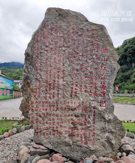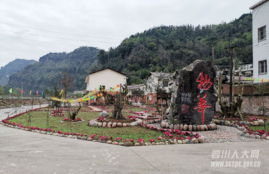 众筹活动的成功,空前激发了村民参与村级建设的热情,代表与村民们与商议后,决定利用新建休闲广场未绿化的600余米空地,立“感恩石”,修“物华园”,感恩社会各级人士的爱心捐赠。思路既定,说干就干,代表和村民们一起寻来高达十余米的“感恩石”立于园中,并邀请荥经中学教师赖夏初亲撰“映山红众筹碑记”雕刻于石上;冒着烈日炎炎在山中寻来“筑梦”古树栽种在石旁,寓意爱心筑起新的希望;村里男女老少从荥河中挑选精美石子在园中铺起4条石头健身小径,并移来自家栽种的紫荆花、杜鹃花、栀子花、红豆杉、金弹子、罗汉松等不断为园中增添新绿。阳春三月,春草萌动,映山红花开,集观赏、休闲、健身于一身的“物华园”很快成为了防洪堤旁的又一“网红点”,一时间游客纷纷。