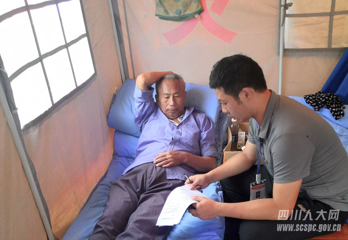 长宁县人大代表、双河镇人大主席卢希(右)安抚受灾群众,记录生活需求
