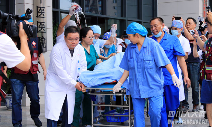 宜宾市人大代表、长宁县中医院院长李华桥(左1)连续24小时战斗在地震伤员救治一线