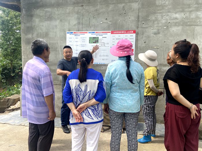 镇人大代表、新堰村党委书记罗通向群众宣传讲解山洪灾害避险知识