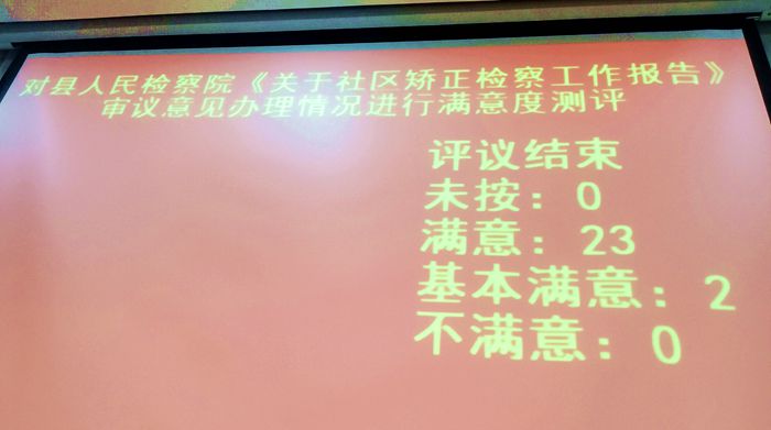 “满意23票,基本满意2票,不满意0票,常委会组成人员对县检察院办理情况是满意的。”社区矫正检察监督工作的实绩获得了县人大常委会组成人员的充分认可。