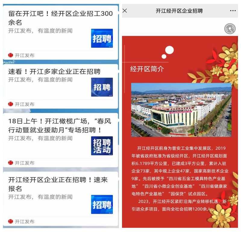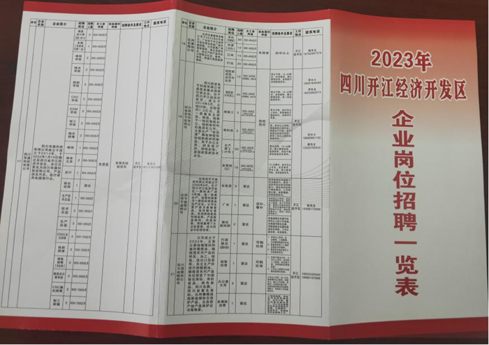 细致摸排明需求。在县人大的督促下,经开区主动对接园区企业,指定专人对园区重点缺工企业逐一联系,全方位梳理统计,详细掌握企业招聘岗位、福利待遇、用工人数等情况,建立健全企业用工信息库,制作《2023年经开区岗位招聘一览表》。同时,超前谋划制定《2023年开江经开区企业招工工作方案》,积极抢抓春节期间在外务工人员返乡有利时机,精心筹备系列招聘活动,帮助企业精准招人。
