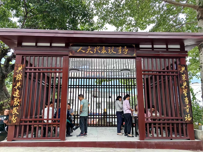 集镇每逢农历一四七都要赶集,千万贯乡人大主席团抓住人大代表“家站”建设契机,本着实用便民原则,充分征求代表意见建议,盘活乡政府院坝内一块闲置已久的场地,打造人大代表联络站,科学设置功能区域,有效利用有限空间,为群众提供公共交流空间。古意盎然的亭子人大代表“议事亭”,劳累可小憩,风雨可暂避,成为群众拉家常、提意见、话发展的小天地。