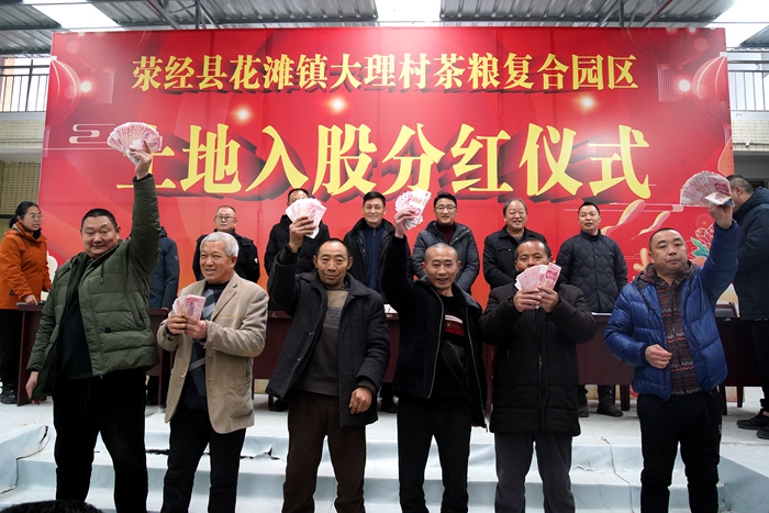 2024年2月22日,元宵节前夕,荥经花滩镇大理村村民们齐聚一堂,参加茶粮复合园区土地入股分红仪式。大家你一言我一语,将春节氛围推向高潮。2023年度,大理村为227户土地入股农民分红42万元。