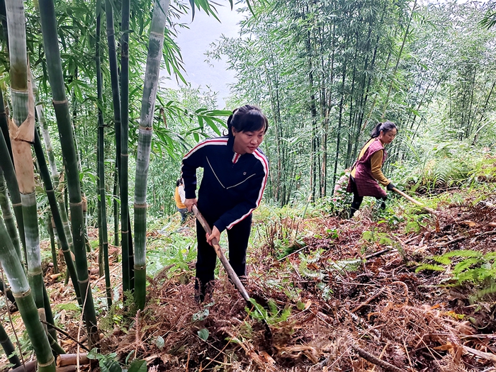 入冬之际,长宁县双河镇笔架村的文丰现代竹产业基地一片郁郁葱葱之景。11月13日,在基地的佯黄竹有机竹笋培育示范林里,长宁县人大代表、文丰家庭农场负责人彭玉琴正和农户们一道忙碌着清理林间杂草,精心为来年竹笋竹材丰收开展管护工作。