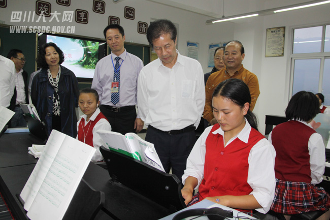 在峨边职教中心,陈光志一行一边查看调酒室、插花室、机电室、电焊室等教室,一边询问该校软硬件设施建设情况,了解学生学习生活状况。在钢琴室,陈志光与学生进行了亲切交流,还饶有兴趣地倾听了学生的现场演奏,并鼓励他们通过自己的努力,学到一技之长,找到一份适合自己的工作。在学生作品展示厅,陈光志指出,职业教育就是要让学生将理论知识与实际操作紧密结合起来,真正学好职业技能,通过就业帮助家庭脱贫。