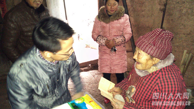 2016年春节临近,省人大常委会预算工委支部的全体同志十分惦记结对帮扶村群众的生产生活情况。2月1日,预算工委支部书记郭志强带领支委会成员,前往仪陇县双胜镇王家庄村开展帮扶调研及慰问活动。调研组察看了村委会办公环境和通村路桥建设情况,看望了贫困户何勋贵、黄忠才老人。接过慰问金和米面油等慰问品后,老人激动地说:“谢谢你们!谢谢省人大!谢谢共产党!”