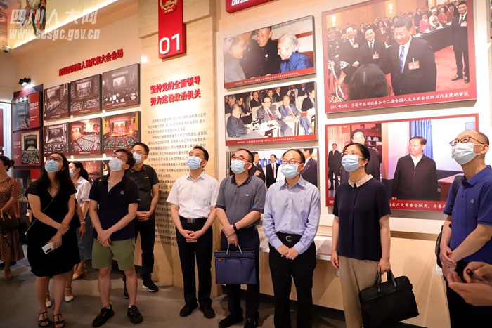 致公党的同志们来到省人大常委会机关历史陈列馆,工作人员一路讲解、一路引导,通过丰富的图片、沧桑的实物、现代的视频、真实的场景,详实介绍了四川人大发展历程,人民代表大会制度的基本框架,人大职能职责,各级人大代表的产生,人大常委会在立法、监督、任免、重大事项决定、代表工作、自身建设等方面取得的巨大成就。