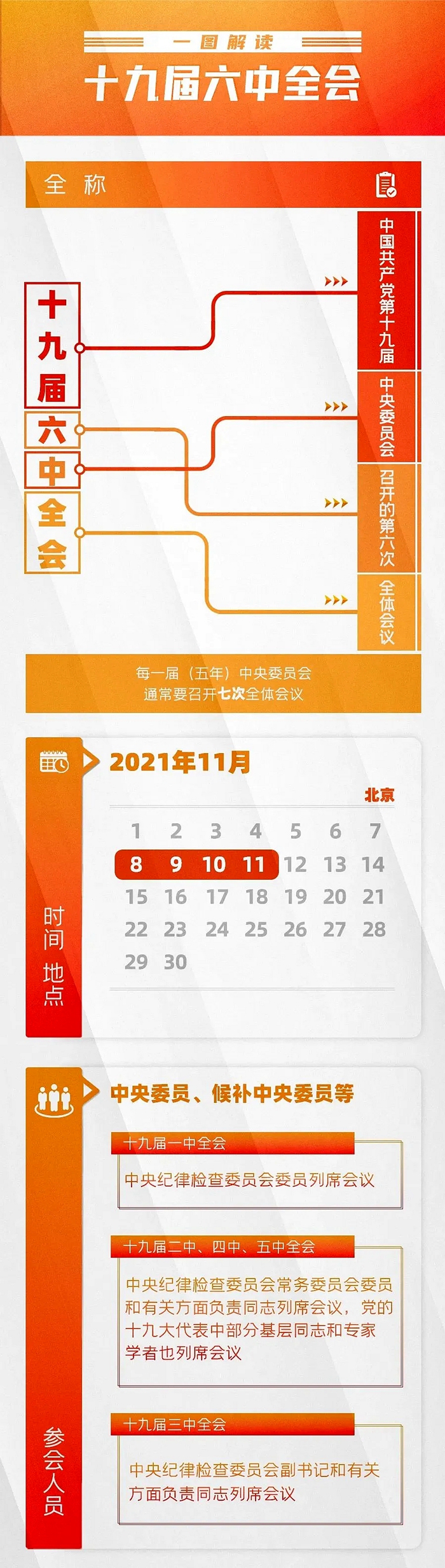 2021年11月8日至11日,中国共产党第十九届中央委员会第六次全体会议将在北京召开。