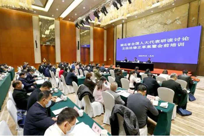 2月7日,湖北省人大常委会组织召开部分在鄂全国人大代表研读讨论立法法修正草案暨会前培训。摄影/刘浪