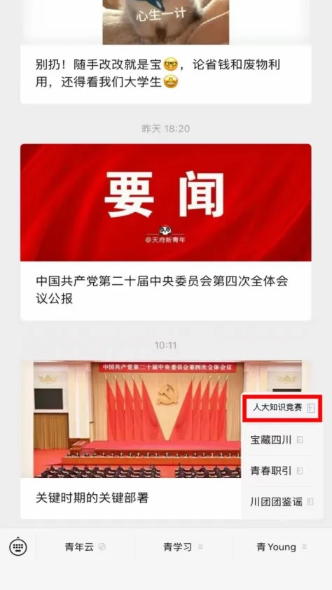 第二步:进入菜单选择“青Young”,点击“人大知识竞赛”,点击即可参与答题。