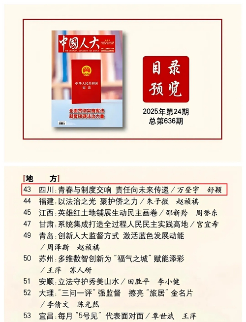 近日出版的2025年第24期《中国人大》杂志,刊发了省人大常委会办公厅开展“人大与青春同行”系列活动宣传稿件《四川:青春与制度交响 责任向未来传递》。