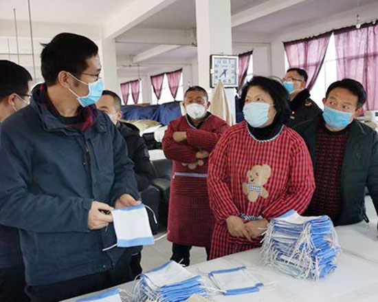 胡英(右二)请有关部门来指导口罩生产