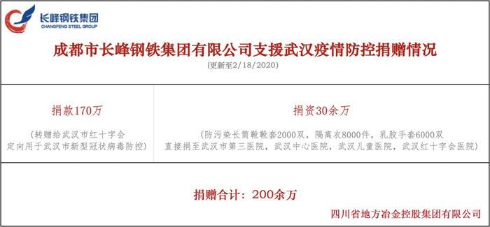 在都江堰市人大代表陈香官(成都市长峰钢铁集团有限公司董事长)的带领下,成都市长峰钢铁集团有限公司严格按照党和政府的相关要求,做好企业自身疫情防控工作,运用信息技术手段加强企业管理、进行企业员工疫情防护知识培训等,坚决做到防控安全、员工安全、生产安全。同时, 积极响应党和国家的号召,切实担负起企业的社会责任,为疫情严重地区伸出援助之手。