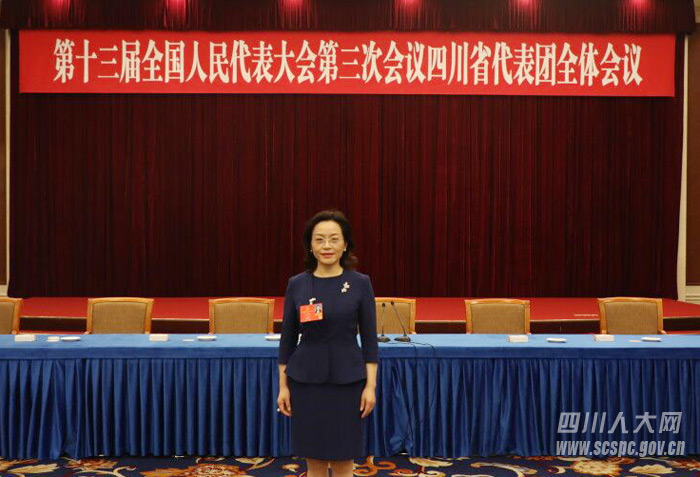 图为十三届全国人大代表蒋丽英在十三届全国人大第三次会议四川代表团全团会议会场。
