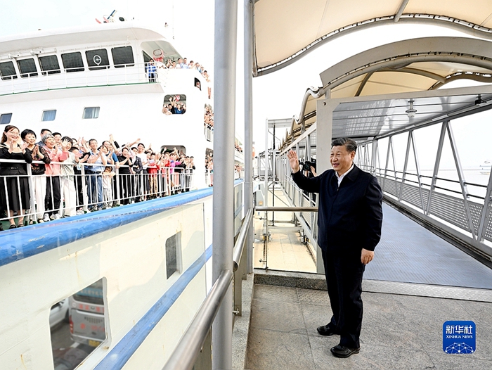 4月10日至13日,中共中央总书记、国家主席、中央军委主席习近平在广东考察。这是10日下午,习近平在湛江市徐闻县徐闻港泊位码头,向船上的旅客挥手致意。新华社记者 燕 雁摄