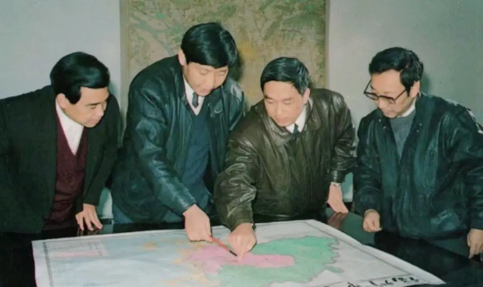 1991年12月,习近平与同事讨论福州市战略规划设想。(图源:《习近平在福州》)